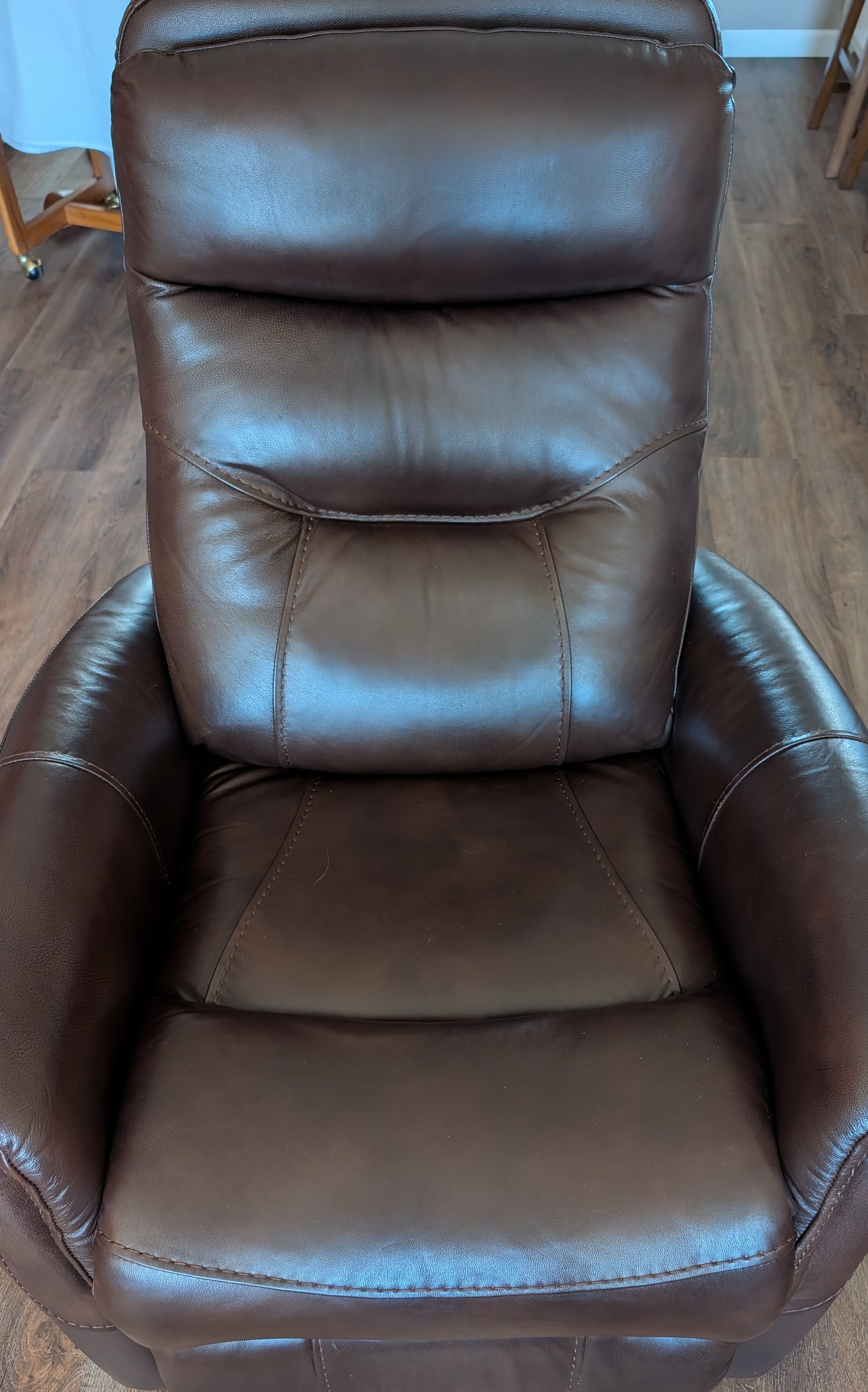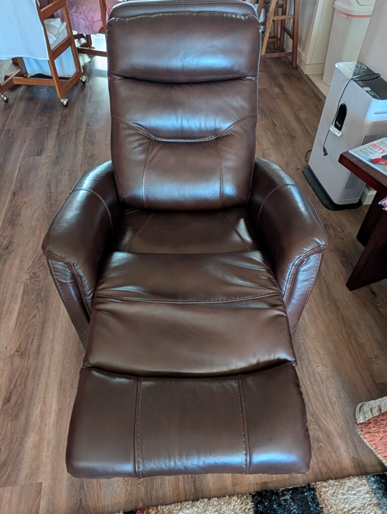 This chair is like new. It has everything you need in a chair, it rocks, reclines and swivels. It is brown and looks like leather. From the floor to the top of the back, it measures 42″. The width of the chair at the front of the arms is 31″ and from floor to seat at the front is 18″. Asking $100.00.
