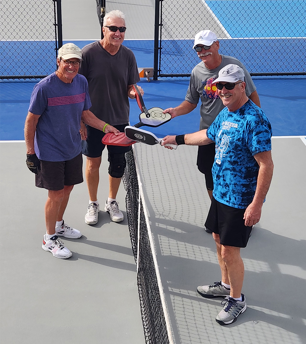 Pickleball is similar to tennis, except it is played on a smaller court with two to four players who use oversized ping pong-like paddles and a perforated plastic ball. If you have never played the game before, the FOS Pickleball Club (FOSPC) can get you started with lessons (seasonally), and the FOS Pickleball League can help you meet other pickleball enthusiasts to play with throughout the week.