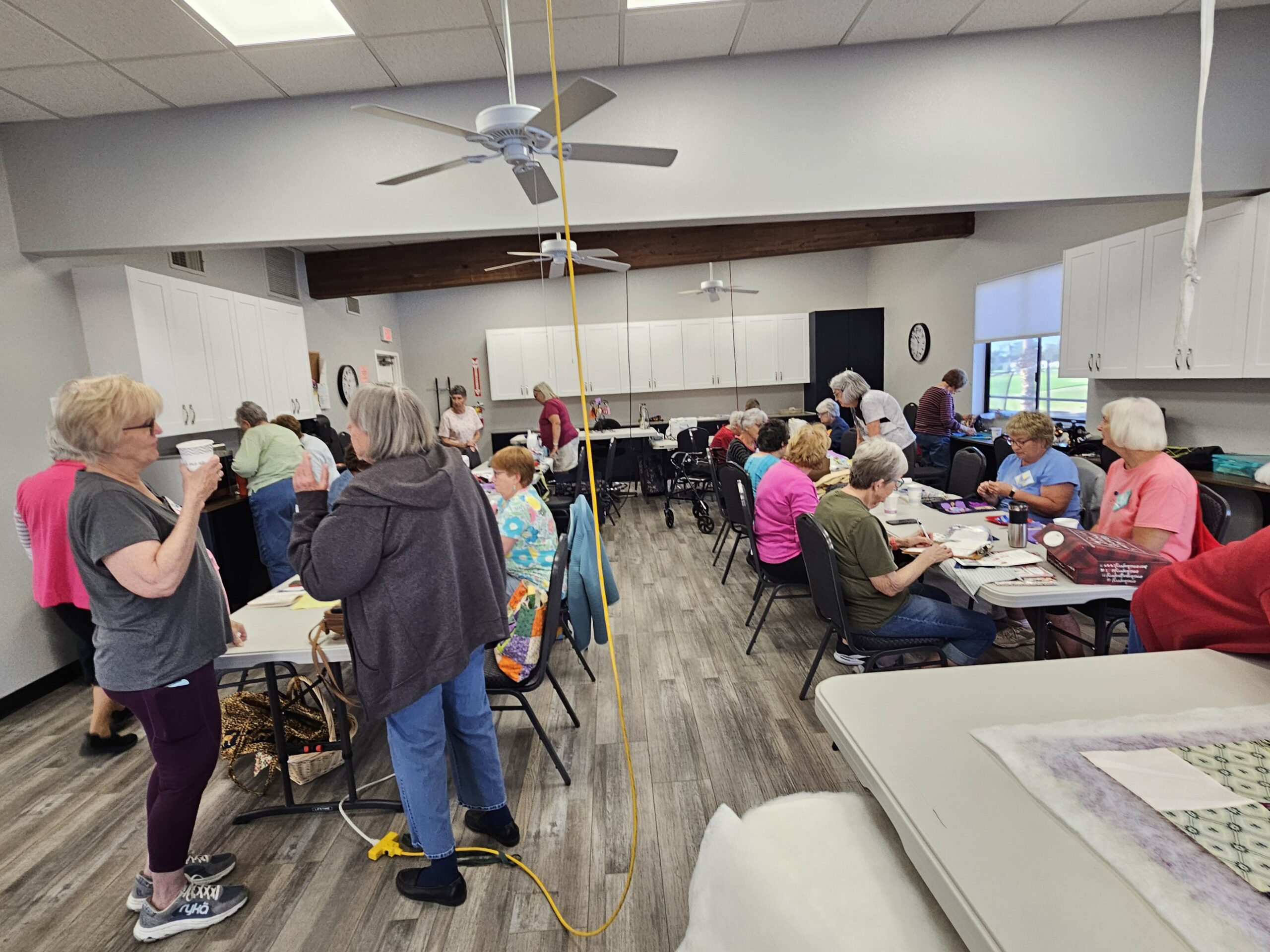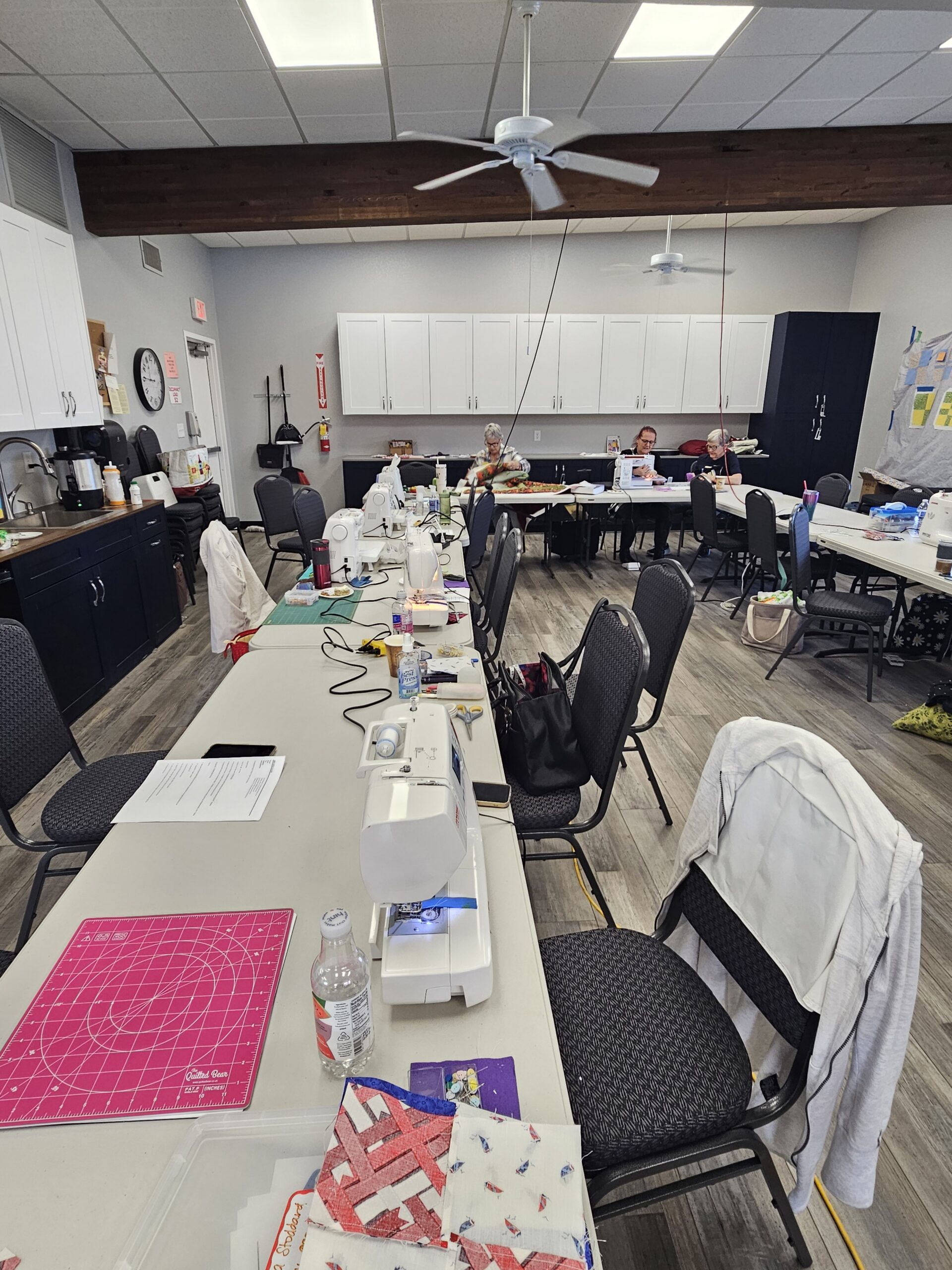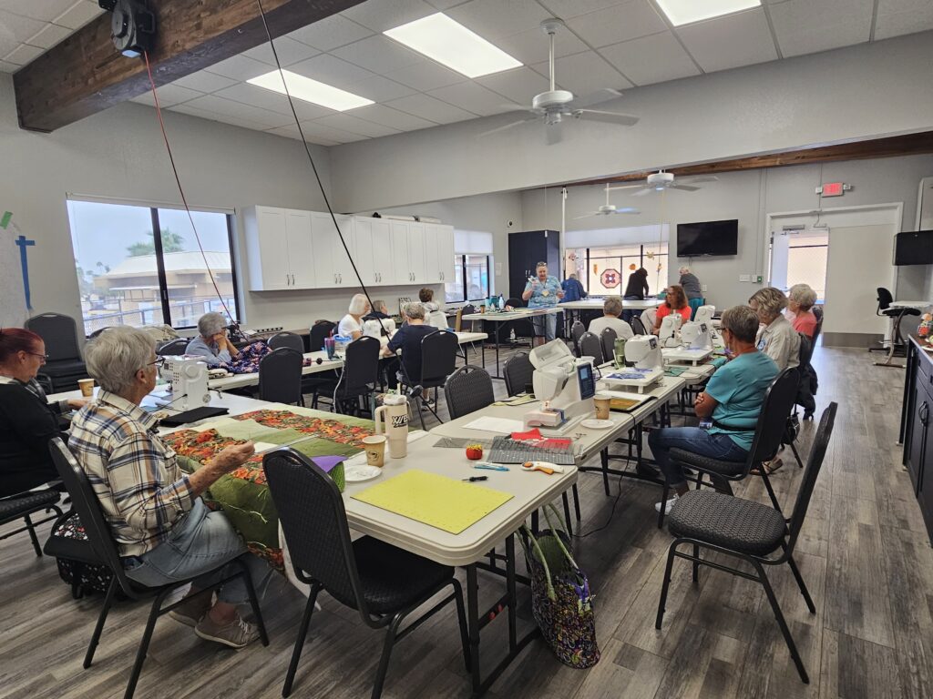 Each year we hold a retreat in the activity center where we can spread out and have a full fun day of sewing and quilting camaraderie.